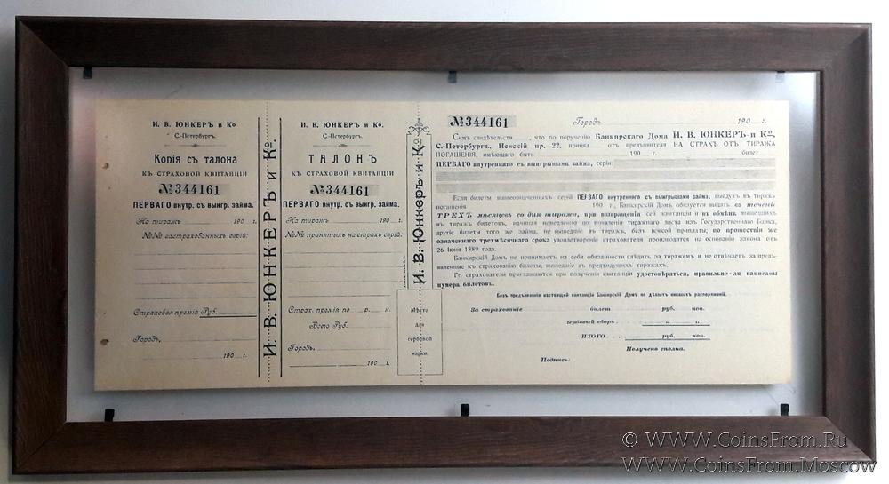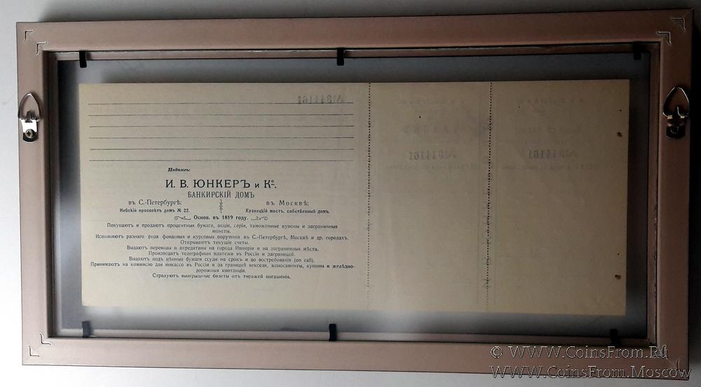 Свидетельство Банкирского Дома И.В. Юнкер и К 1900 г. Подлинный старинный документ. Размер рамки 44х23 см. Стекло антиблик.