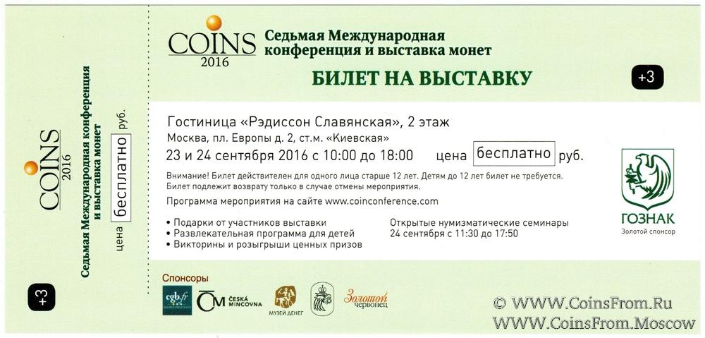 Входной билет на выставку "COINS" 2016 г. Седьмая Международная конференция и выставка монет.