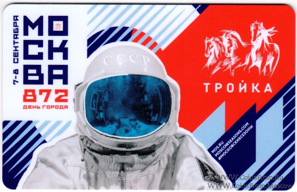 На аверсе: дизайн 872-летия Москвы, с изображением традиционных цветов и рисунка в виде геометрических фигур (прямоугольников) — символа Дня города, скафандра космонавта СССР.