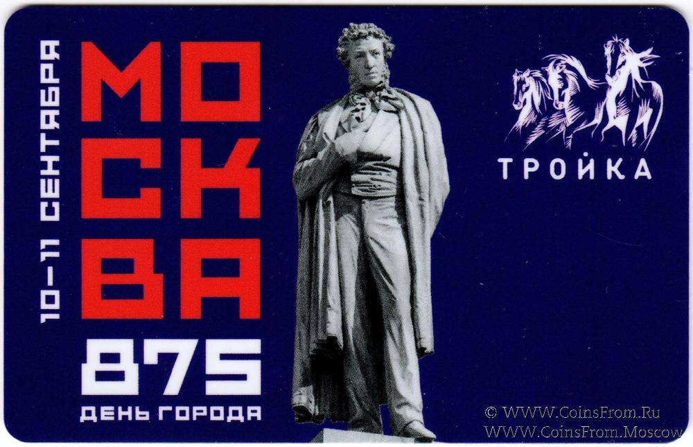 Электронная транспортная карта "Тройка". Размер: 85,5 x 54 мм. Тематическая "Тройка" выпущена с двумя праздничными дизайнами. На аверсе дизайн 875-летия Москвы (вариант 1): дата 10-11 сентября, изображение памятника Александру Пушкину.