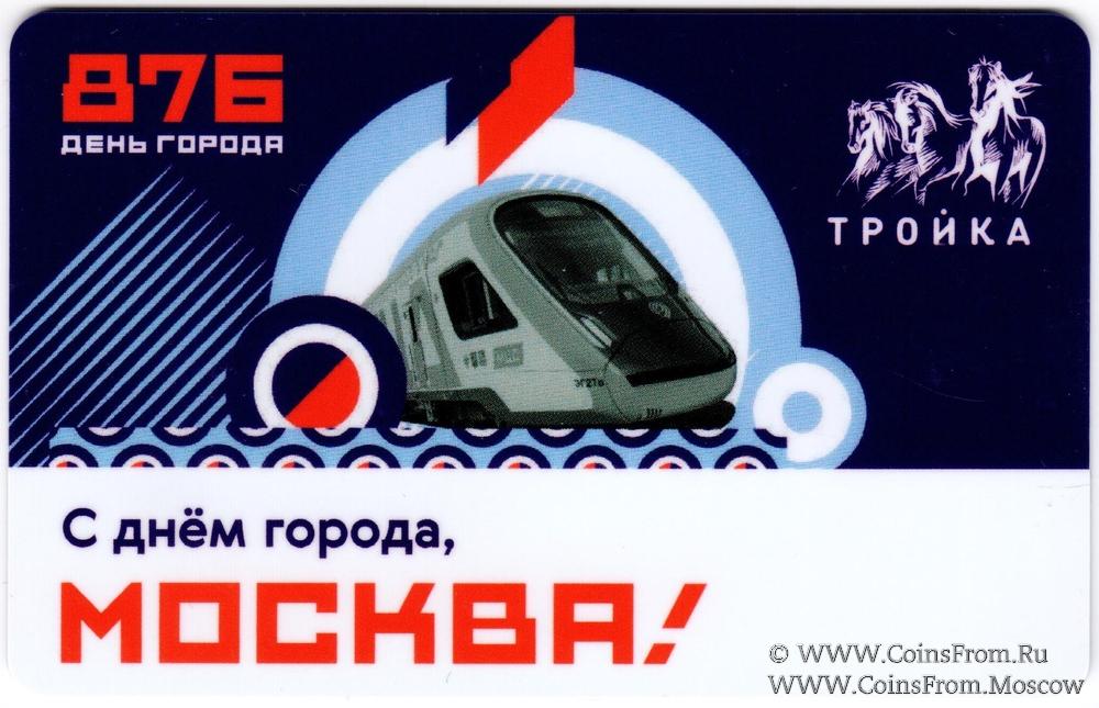 На аверсе дизайн 876-летия Москвы (вариант 1): поезд "Иволга" в стилистике и цветах, которые выбрали для оформления столицы в этом году.