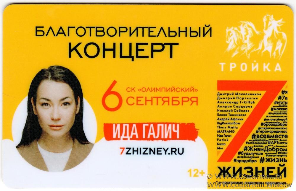Электронная транспортная карта "Тройка". Размер: 85,5 * 54 мм. На аверсе: "Благотворительный концерт "7 жизней" (Ида Галич).