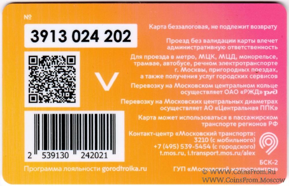 Карта беззалоговая (сувенирная), не подлежит возврату. Проезд без валидации карты влечет административную ответственность. Для проезда в метро, МЦК, МЦД, монорельсе, трамвае, автобусе, речном электротранспорте г. Москвы, пригородных поездах, а также получения услуг городских сервисов.