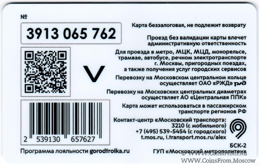 Карта беззалоговая (3913), не подлежит возврату. Проезд без валидации карты влечет административную ответственность. Для проезда в метро, МЦК, МЦД, монорельсе, трамвае, автобусе, речном электротранспорте г. Москвы, пригородных поездах, а также получения услуг городских сервисов.