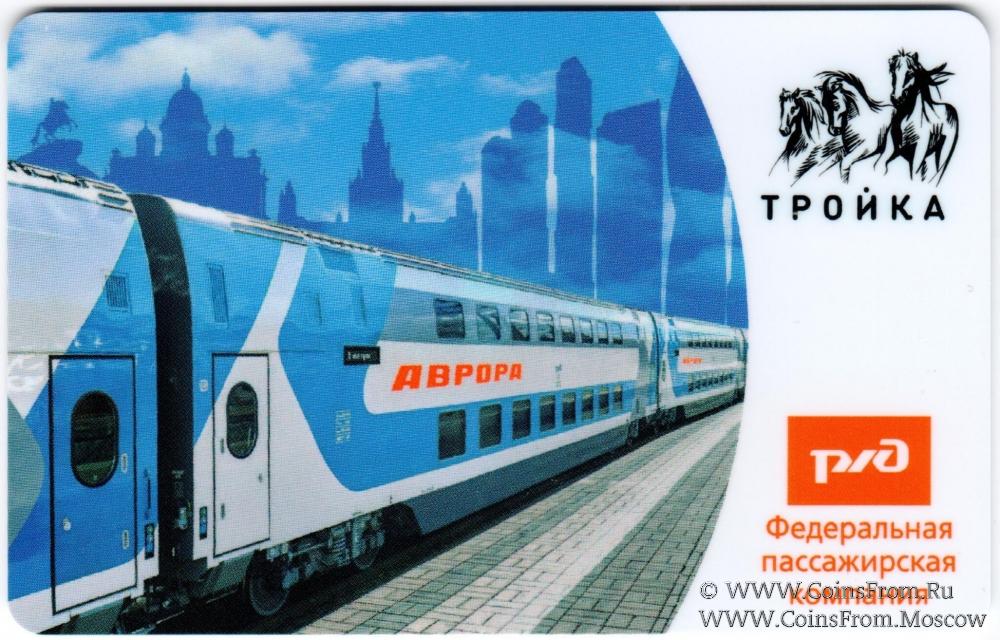 Электронная транспортная карта "Тройка". Размер: 85,5 * 54 мм. Карта "Тройка" с рисунками фирменных поездов ФПК: скоростной фирменный поезд "Аврора".