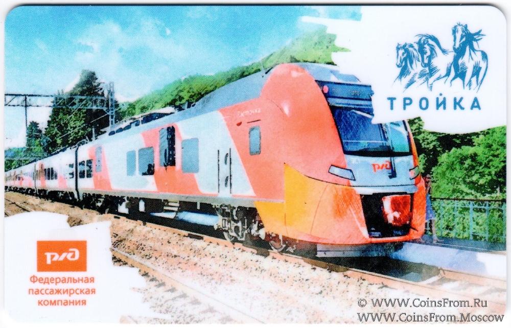 Электронная транспортная карта "Тройка". Размер: 85,5 * 54 мм. Карта "Тройка" с рисунками фирменных поездов Федеральной пассажирской компании (ФПК – дочерняя компания ОАО "РЖД") - скоростной электропоезд "Ласточка". На картах появился новый вариант первого абзаца на обратной стороне карты: "Карта беззалоговая, не подлежит возврату".