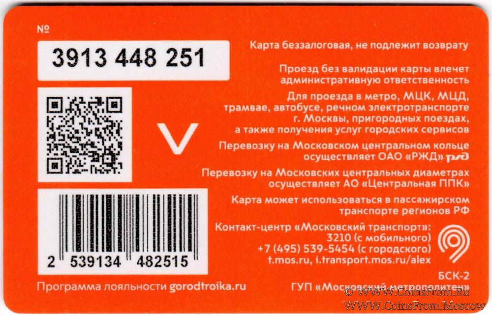 Карта сувенирная (3913) беззалоговая, не подлежит возврату. Проезд без валидации карты влечет административную ответственность. Для проезда в метро, МЦК, МЦД, трамвае, автобусе, речном электротранспорте г. Москвы, пригородных поездах, а также получения услуг городских сервисов.