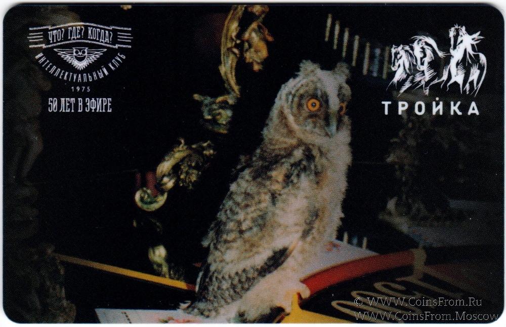 Электронная транспортная карта "Тройка". Размер: 85,5 x 54 мм. Серия из четырёх карт "Тройка", посвящённая 50-летию телевизионной интеллектуальной игры "Что? Где? Когда?". Вариант 3 (сова).