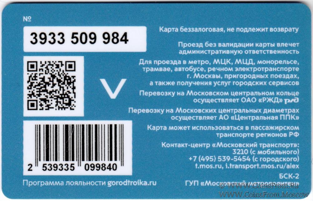 Карта подарочная (3933) беззалоговая, не подлежит возврату. Проезд без валидации карты влечет административную ответственность. Для проезда в метро, МЦК, МЦД, монорельсе, трамвае, автобусе, речном электротранспорте г. Москвы, пригородных поездах, а также получения услуг городских сервисов.
