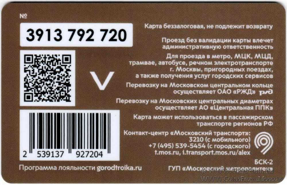 Карта сувенирная (3913) беззалоговая, не подлежит возврату. Проезд без валидации карты влечет административную ответственность. Для проезда в метро, МЦК, МЦД, трамвае, автобусе, речном электротранспорте г. Москвы, пригородных поездах, а также получения услуг городских сервисов.