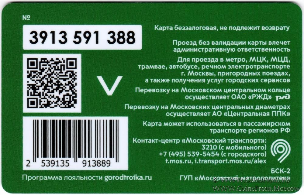 Карта сувенирная (№ 3913) беззалоговая, не подлежит возврату. Проезд без валидации карты влечет административную ответственность. Для проезда в метро, МЦК, МЦД, монорельсе, трамвае, автобусе, речном электротранспорте г. Москвы, пригородных поездах, а также получения услуг городских