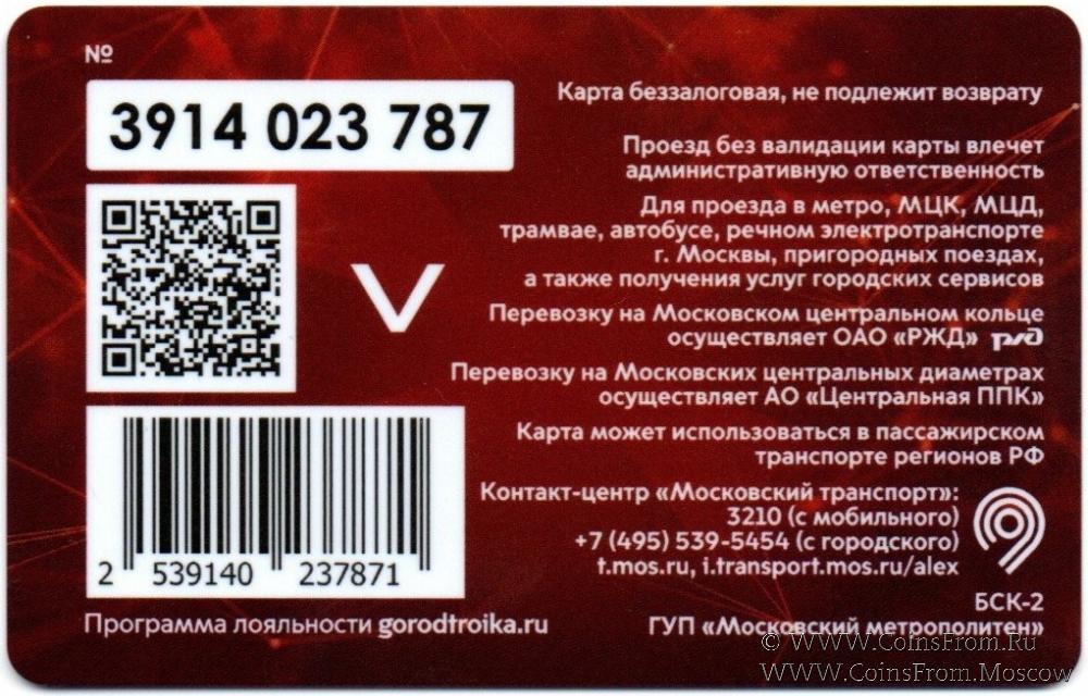 Карта сувенирная (3914) беззалоговая, не подлежит возврату. Проезд без валидации карты влечет административную ответственность. Для проезда в метро, МЦК, МЦД, трамвае, автобусе, речном электротранспорте г. Москвы, пригородных поездах, а также получения услуг городских сервисов.