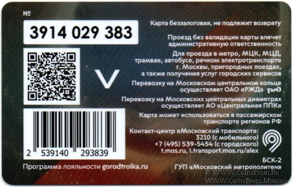 Карта сувенирная (3914) беззалоговая, не подлежит возврату. Проезд без валидации карты влечет административную ответственность. Для проезда в метро, МЦК, МЦД, трамвае, автобусе, речном электротранспорте г. Москвы, пригородных поездах, а также получения услуг городских сервисов.