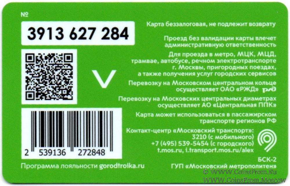Карта сувенирная (3913) беззалоговая, не подлежит возврату. Проезд без валидации карты влечет административную ответственность. Для проезда в метро, МЦК, МЦД, трамвае, автобусе, речном электротранспорте г. Москвы, пригородных поездах, а также получения услуг городских сервисов.