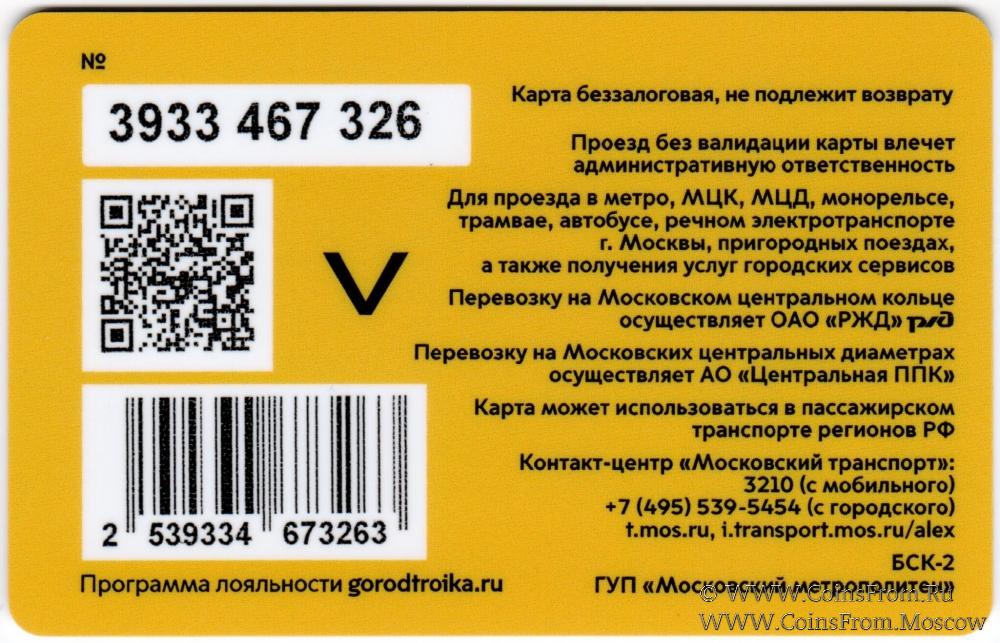 Карта подарочная (3933) беззалоговая, не подлежит возврату. Проезд без валидации карты влечет административную ответственность. Для проезда в метро, МЦК, МЦД, монорельсе, трамвае, автобусе, речном электротранспорте г. Москвы, пригородных поездах, а также получения услуг городских сервисов.