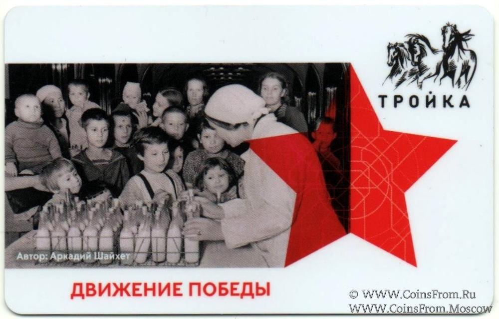 Электронная транспортная карта "Тройка". Размер: 85,5 * 54 мм. На аверсе: дизайн: Движение Победы. Автор: Аркадий Шайхет.
