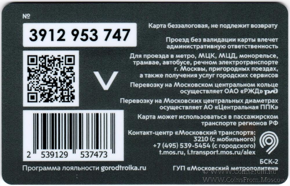 Карта беззалоговая (№ 3912), не подлежит возврату. Для проезда в метро, МЦК, МЦД, монорельсе, трамвае, автобусе, речном автотранспорте г. Москвы, пригородных поездах, а также получения услуг городских сервисов.