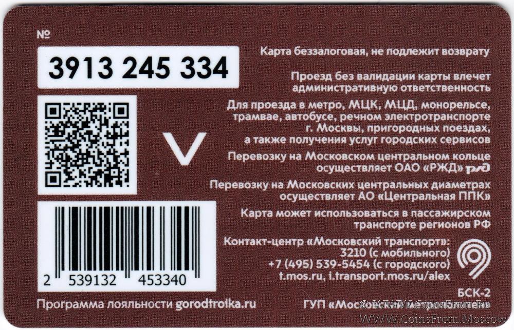 Карта беззалоговая сувенирная (№ 3913), не подлежит возврату. Для проезда в метро, МЦК, МЦД, монорельсе, трамвае, автобусе, речном автотранспорте г. Москвы, пригородных поездах, а также получения услуг городских сервисов.