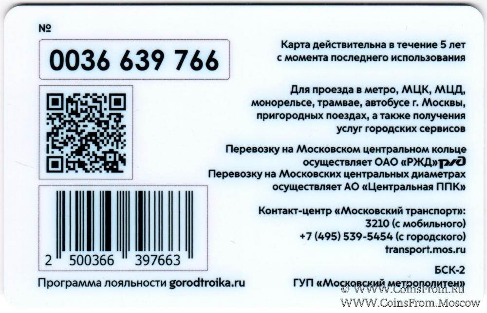 Карта залоговая (0036), действительна в течение 5 лет с момента последнего использования. Для проезда в метро, МЦК, МЦД, монорельсе, трамвае, автобусе г. Москвы, пригородных поездах, а также получения услуг городских сервисов.