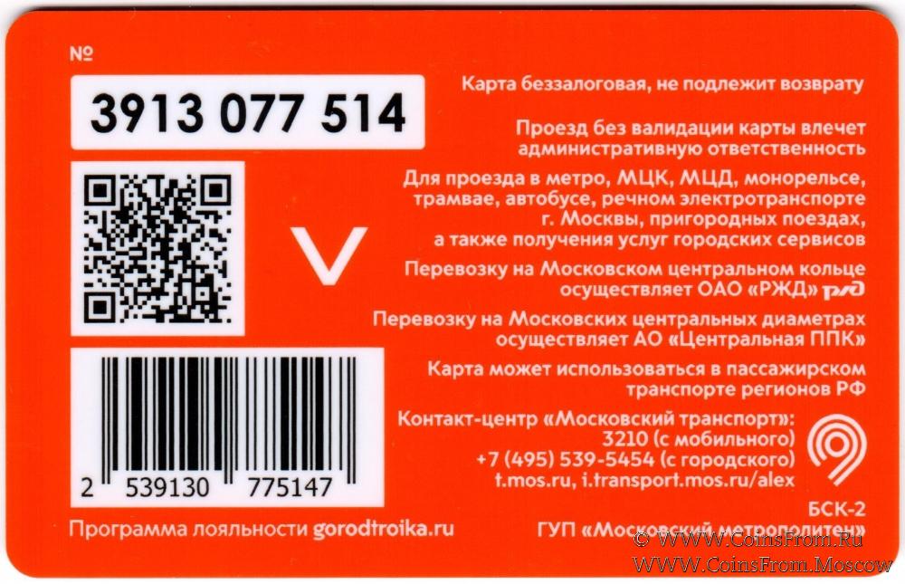 Карта беззалоговая (3913), не подлежит возврату. Проезд без валидации карты влечет административную ответственность. Для проезда в метро, МЦК, МЦД, монорельсе, трамвае, автобусе, речном электротранспоре г. Москвы, пригородных поездах, а также получения услуг городских сервисов.