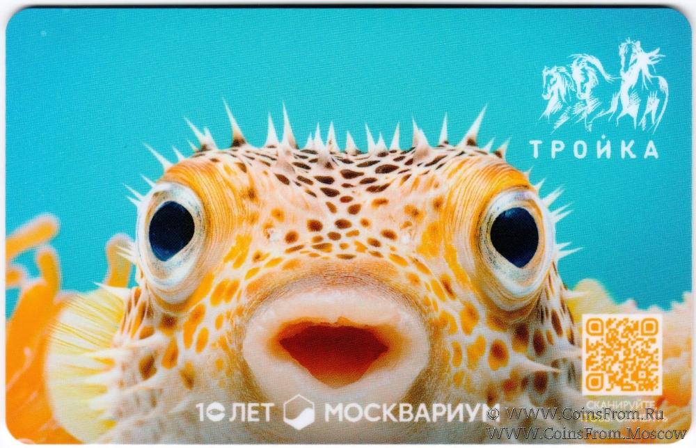 Электронная транспортная карта "Тройка". Размер: 85,5 * 54 мм. Серия из пяти карт "Тройка", посвящённых 10-летию "Москвариума", на которых изображены популярные обитатели океанариума (рыба фугу):
