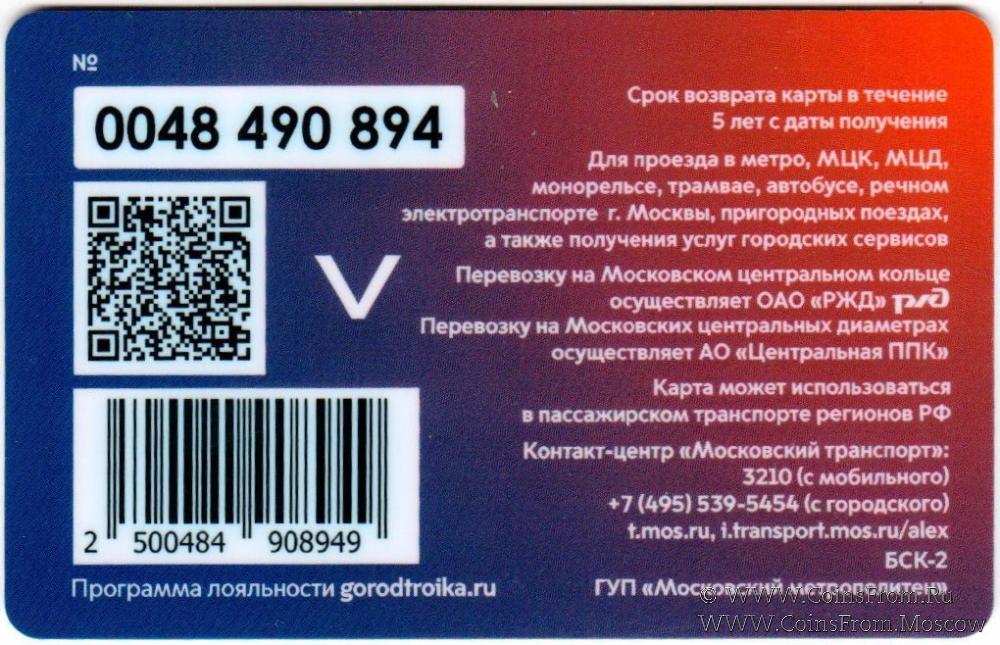 Карта залоговая (0048). Для проезда в метро, МЦК, МЦД, монорельсе, трамвае, автобусе, речном электротранспорте г. Москвы, пригородных поездах, а также получения услуг городских сервисов.