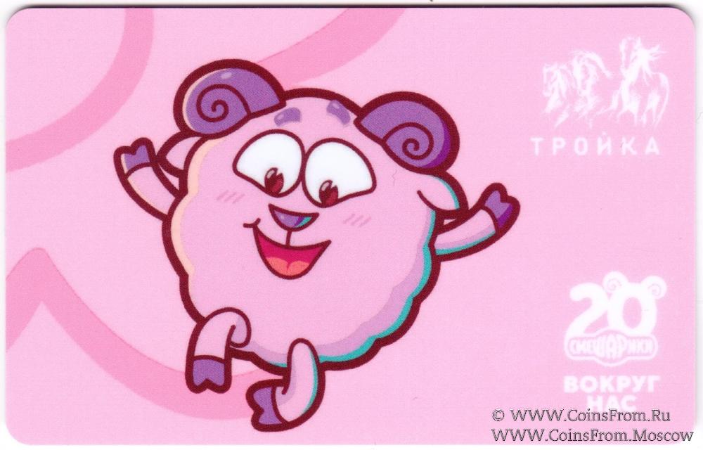 Электронная транспортная карта "Тройка". Размер: 85,5 * 54 мм. Карта "Тройка" с изображениями персонажей из мультсериала "Смешарики" (Бараш), посвященные 20-летию создания, приурочены ко Дню защиты детей (1 июня).