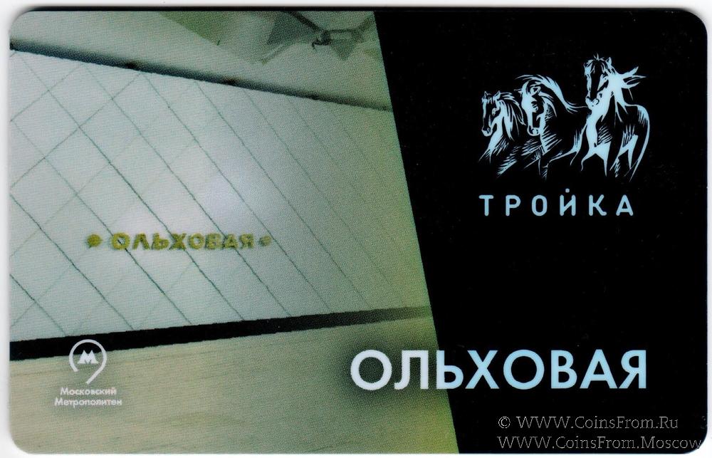 Электронная транспортная карта "Тройка". Размер: 85,5 * 54 мм. На аверсе: дизайн Станция метро "Ольховая". Станция Сокольнической линии (1) открыта 20 июня 2019 г.