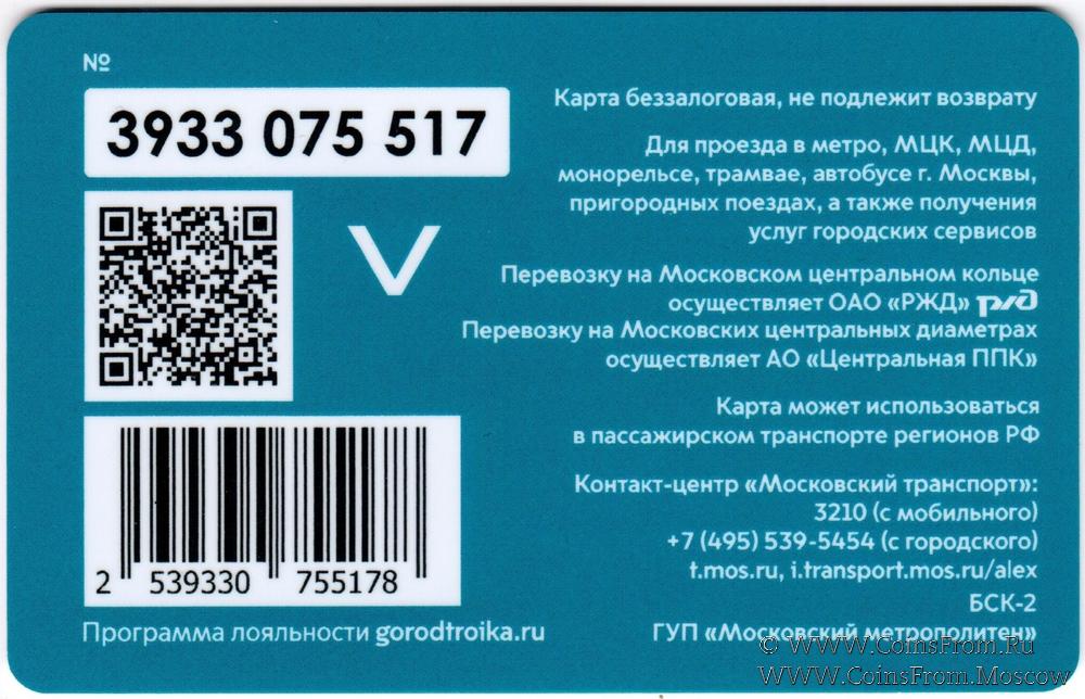 На обороте информация о программе лояльности gorodtroika.ru, перевозчик на МЦД указан как АО "Центральная ПК", добавлена английская буква "V".