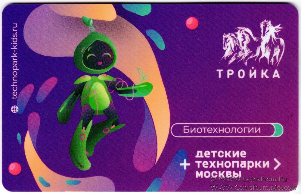 Электронная транспортная карта "Тройка". Размер: 85,5 * 54 мм. Карта "Тройка" посвящена детским технопаркам Москвы. Серия из пяти карт (Биотехнологии).