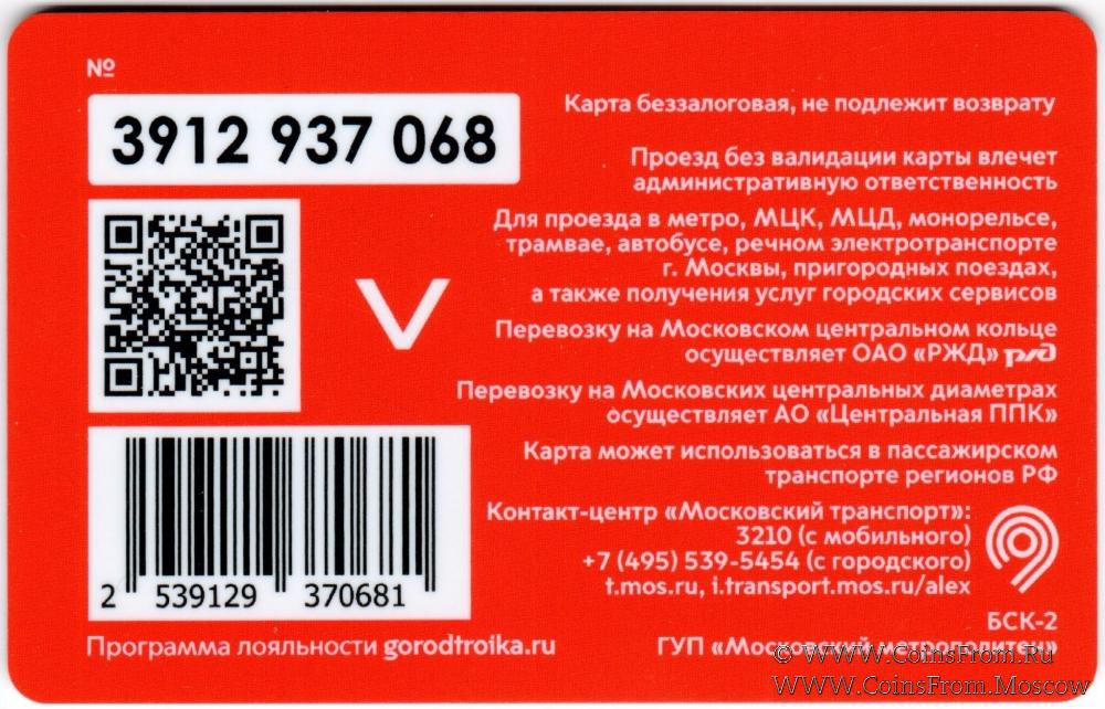 Карта беззалоговая (3912), не подлежит возврату. Проезд без валидации карты влечет административную ответственность. Для проезда в метро, МЦК, МЦД, монорельсе, трамвае, автобусе, речном электротранспорте г. Москвы, пригородных поездах, а также получения услуг городских сервисов.
