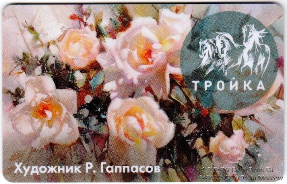 Электронная транспортная карта "Тройка". Размер: 85,5 * 54 мм. На аверсе: дизайн "Картины художника Р. Гаппасова ("Белые розы").