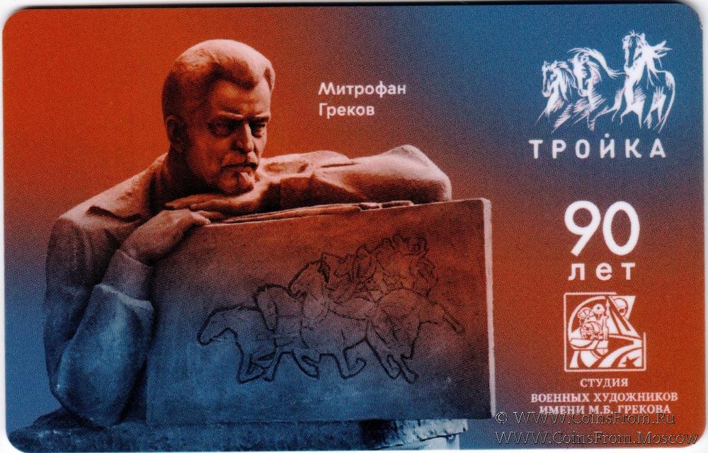Электронная транспортная карта "Тройка". Размер: 85,5 * 54 мм. Тематическая карта "Тройка" посвящена 90-летию Студии военных художников имени М. Б. Грекова. Выпуск 1 (серия из 7 карт): Митрофан Греков. На мини-барельефе, на который облокотился советский живописец, изображение известнейшей картины "Тачанка" (олицетворение победоносной силы Красной Армии) написанной в 1925 году (холст/масло 83х114 см, Государственная Третьяковская галерея, Москва).