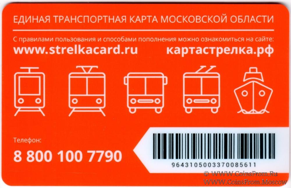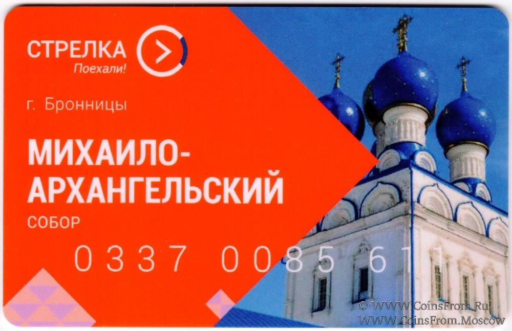 Единая транспортная карта Московской области "Стрелка" и вкладыш с защитным кодом для регистрации в личном кабинете, с телефоном и со ссылками на сайты с правилами пользования и способами пополнения карт. Размер: 85,5 * 54 мм. Серия из 14 карт "Стрелка" с достопримечательностями Московской области: Михаило-Архангельский собор, г. Бронницы.
